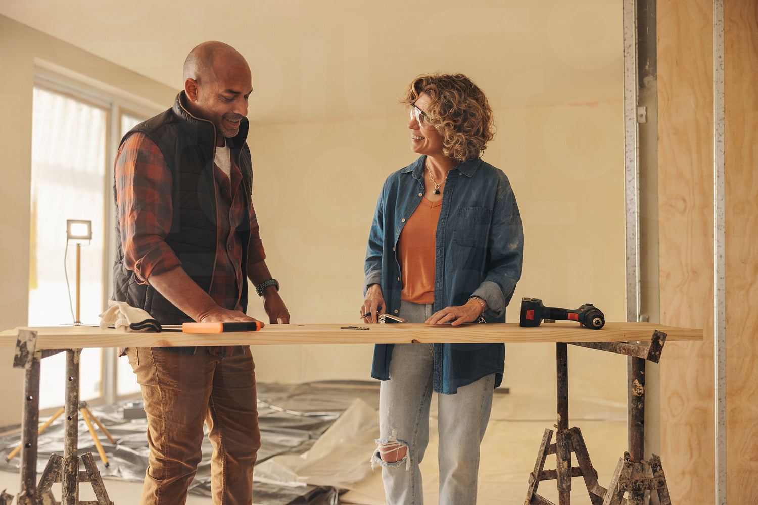 Couple collaborating on a home renovation project. They discuss, plan, and work together indoors. The husband and wife, both mature homeowners, focus on carpentry and woodwork. Their teamwork is evident as they upgrade and remodel the house.