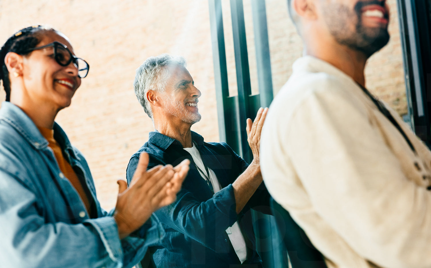 Colleagues expressing appreciation and support at a business meeting in an office environment. Team dynamic and workplace engagement.