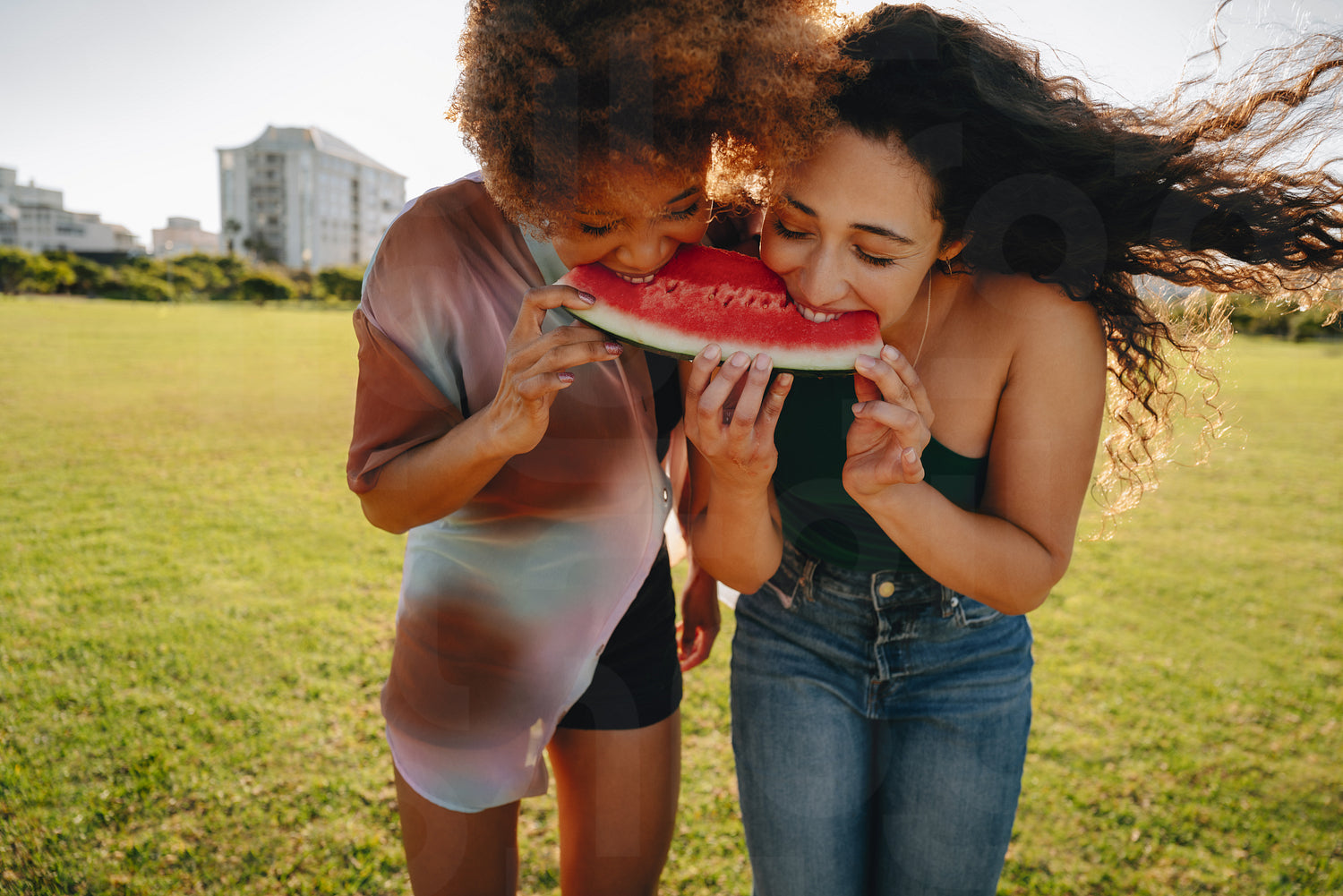 Two college friends share a slice of watermelon outdoors, making the most of their summer break and enjoying the sunny weather and summer vibes in the park.