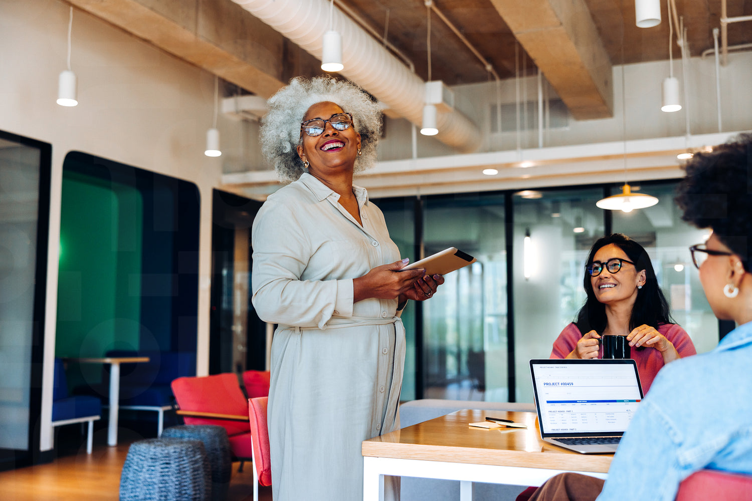 A confident woman stands smiling with a tablet in hand while her team works behind her, embodying experienced leadership and trust.
