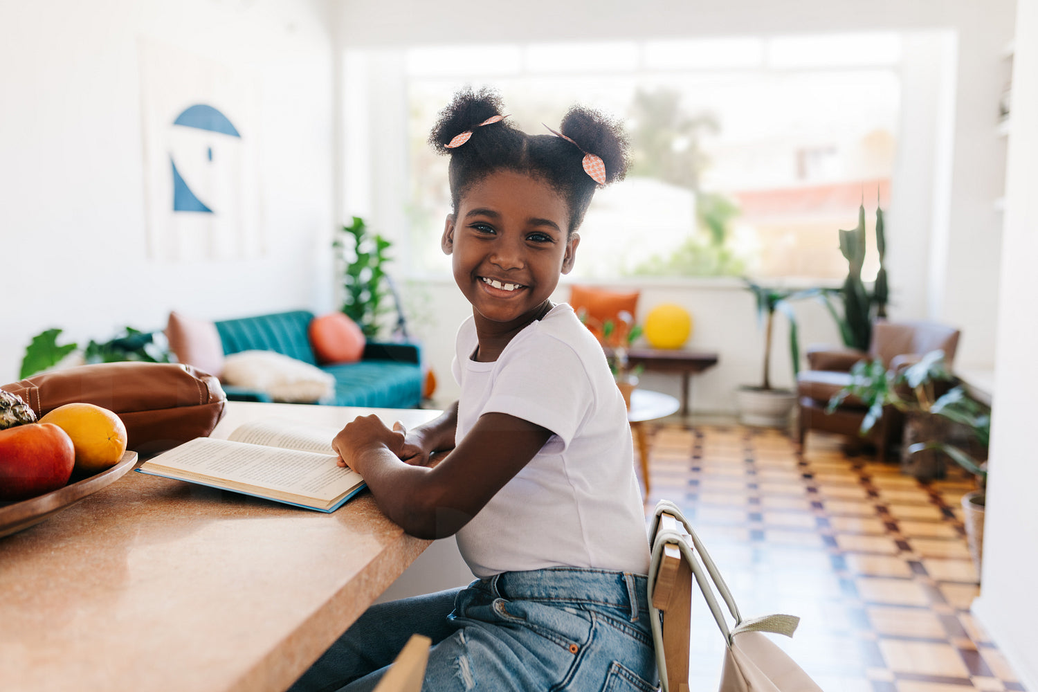 Confident black girl with afro hair sits at home, practicing reading skills with a book in the kitchen. Young school child looking at the camera with a happy smile, showing her love for learning.