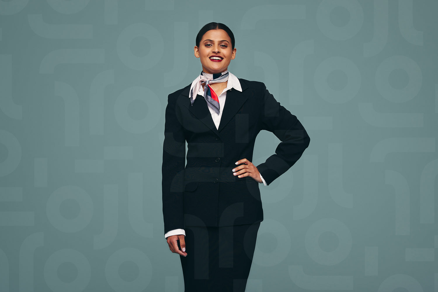 Confident air hostess smiling at the camera while standing in a studio with her hand her hip. Friendly flight attendant wearing her uniform against a studio background.