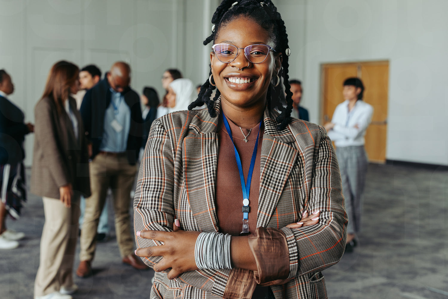 Confident black woman with braided hair and glasses standing at a business conference networking event. Diverse group of professionals in the background.