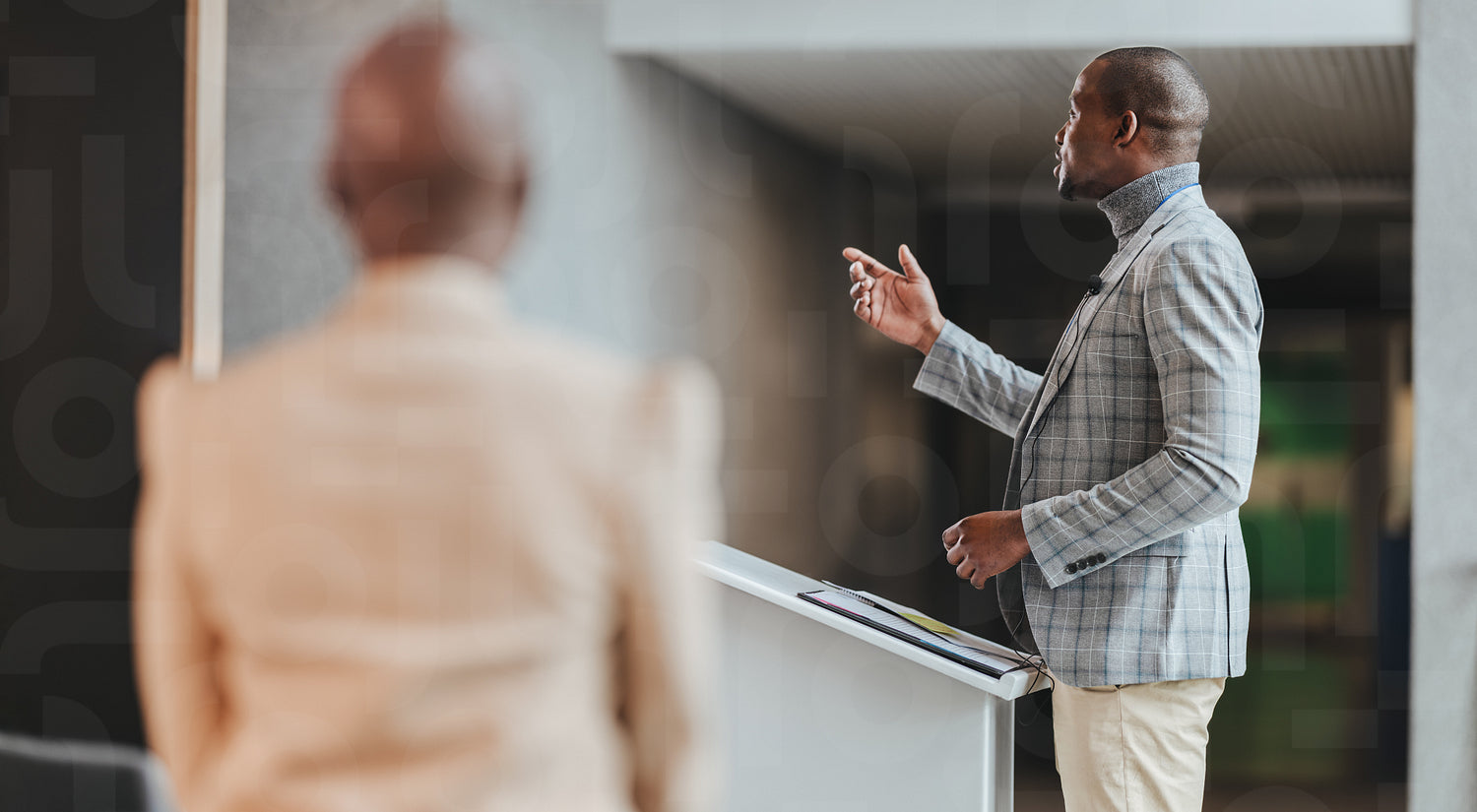 Confident businessman giving presentation at conference, engaging audience with speech, professional corporate event
