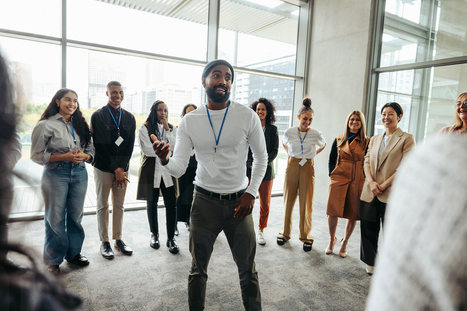 Confident businessman leading an engaging team-building session with a diverse team in a modern office environment, fostering communication and collaboration.