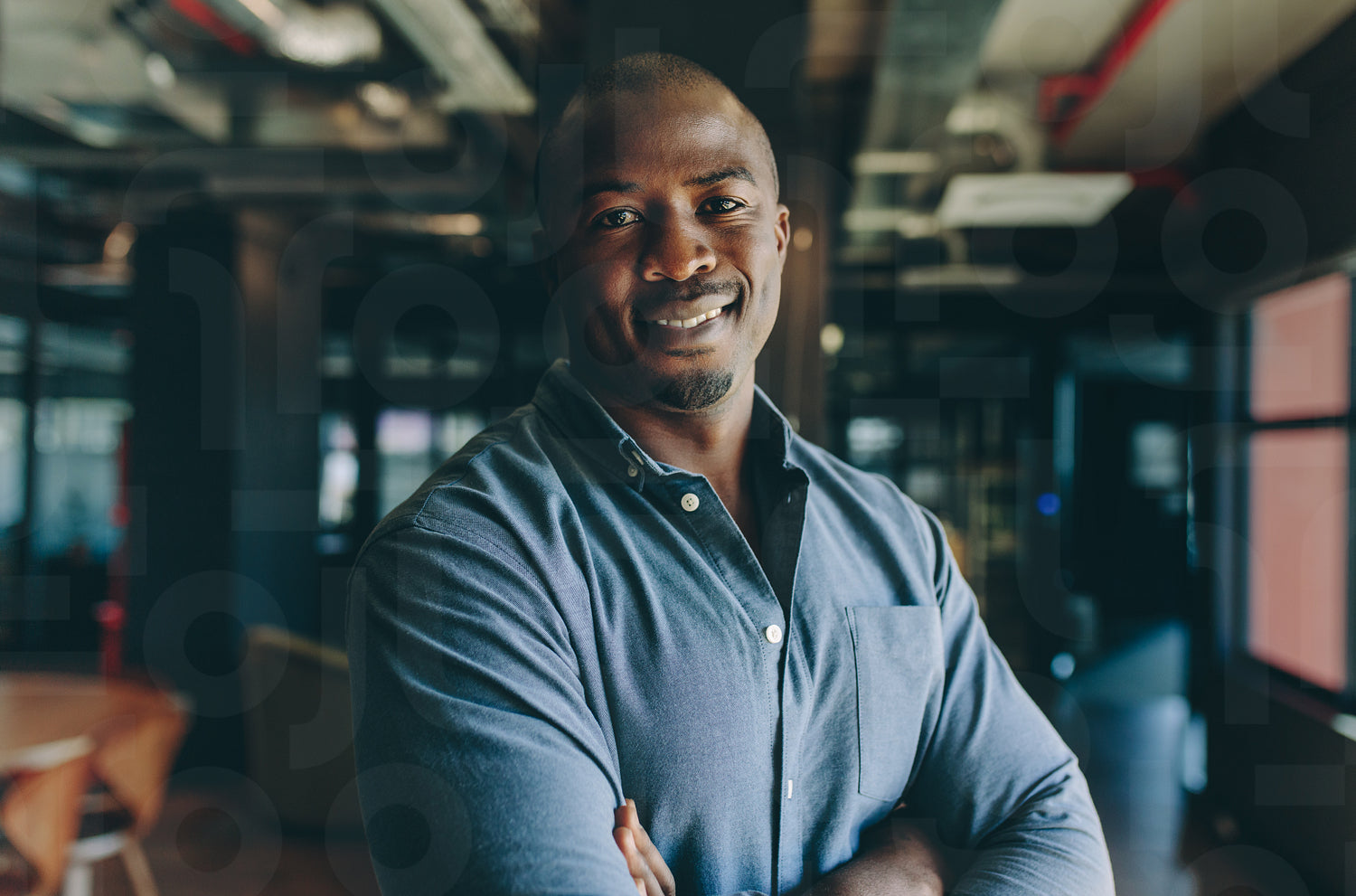 Confident businessman standing in office. African man standing with his arms crossed looking at camera and smiling.
