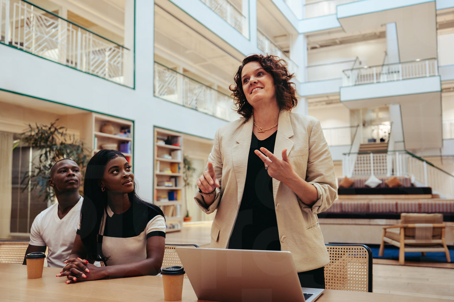 A confident businesswoman presents to her colleagues in a modern office setting. The neutral tones and sleek design convey professionalism and focus.