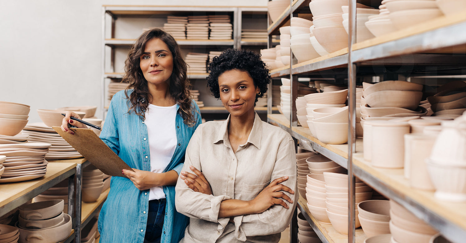 Confident ceramists looking at the camera while working together in their shop. Businesswomen managing a store with handmade ceramic products. Female entrepreneurs running a successful small business.