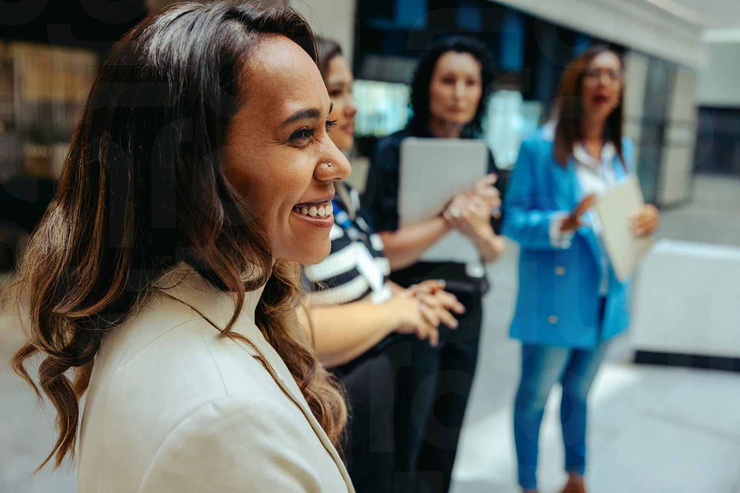A group of professional colleagues gather in a bright office space, engaged in a conversation with a relaxed atmosphere. The focus is on a confident woman smiling, creating a sense of collaboration.