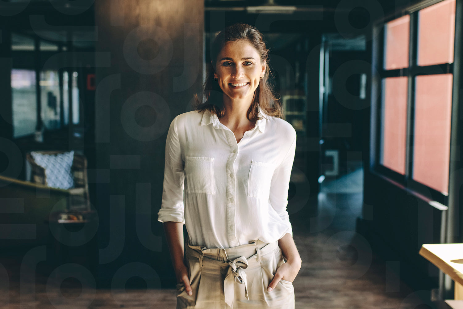 Woman entrepreneur standing in office with her hands in pockets. Smiling businesswoman standing in office.