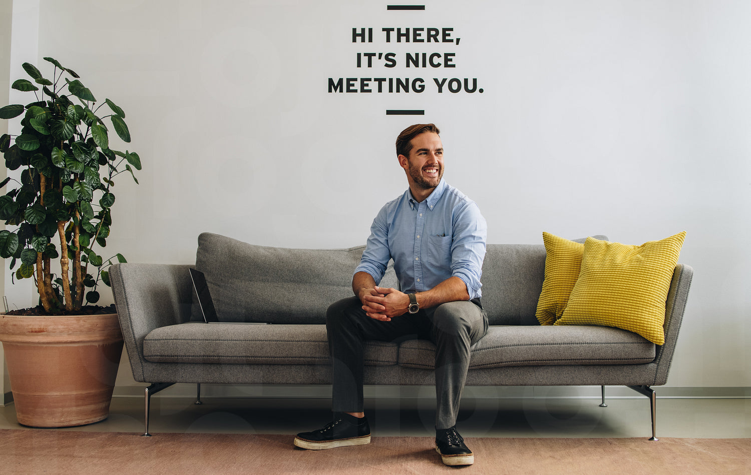 Confident freelancer sitting on sofa. Businessman sitting and looking away in lobby.