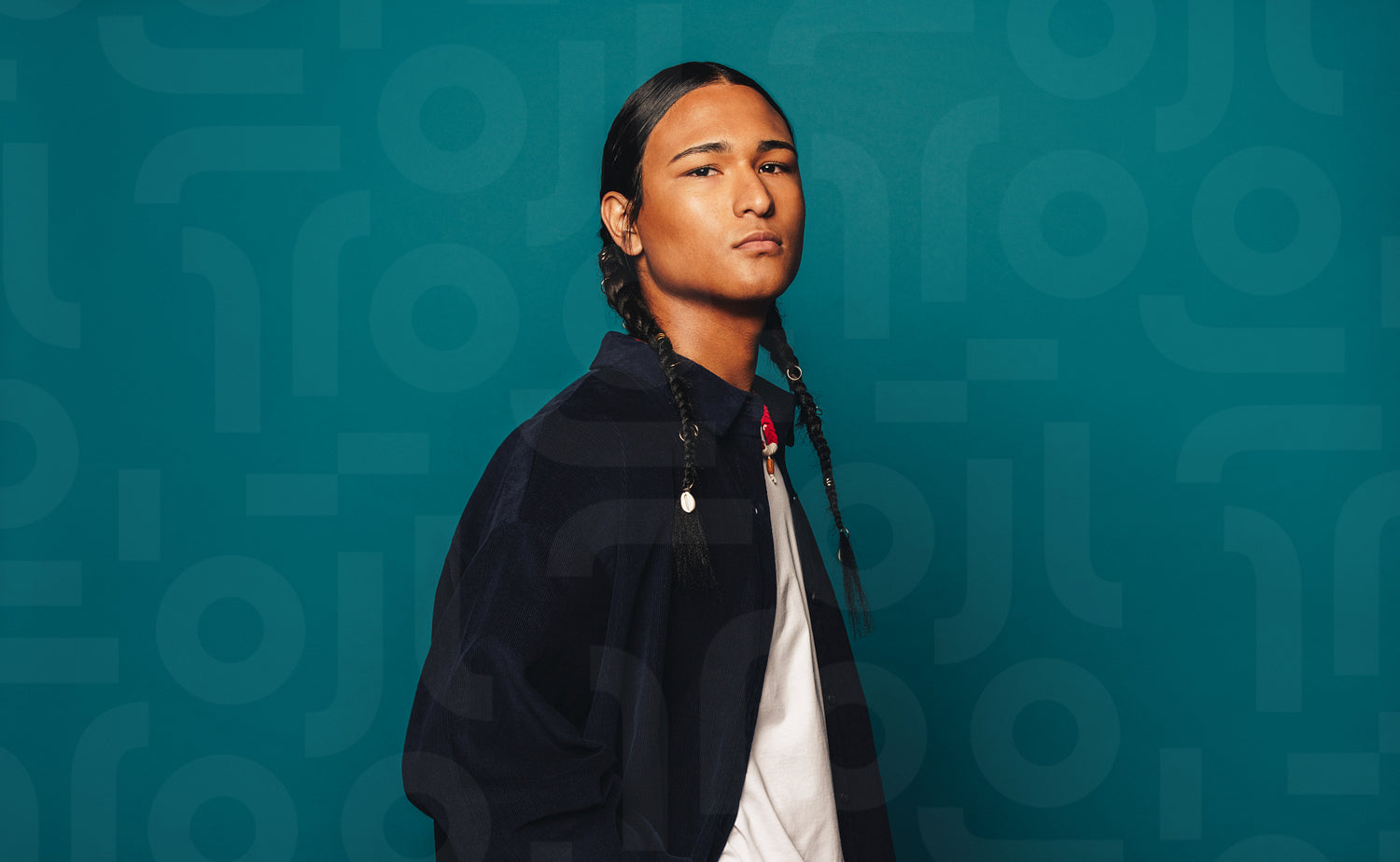 Confident Native American man with braided hair stands against a blue background. Casual yet stylish, he exudes self-confidence. A captivating portrait capturing his strong presence and cultural heritage.
