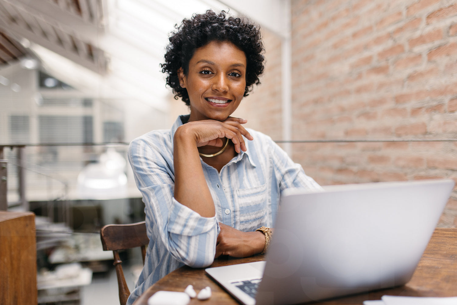 Confident small business owner looking at the camera while sitting in a warehouse. Female entrepreneur working on a laptop. Happy young businesswoman running an online startup.