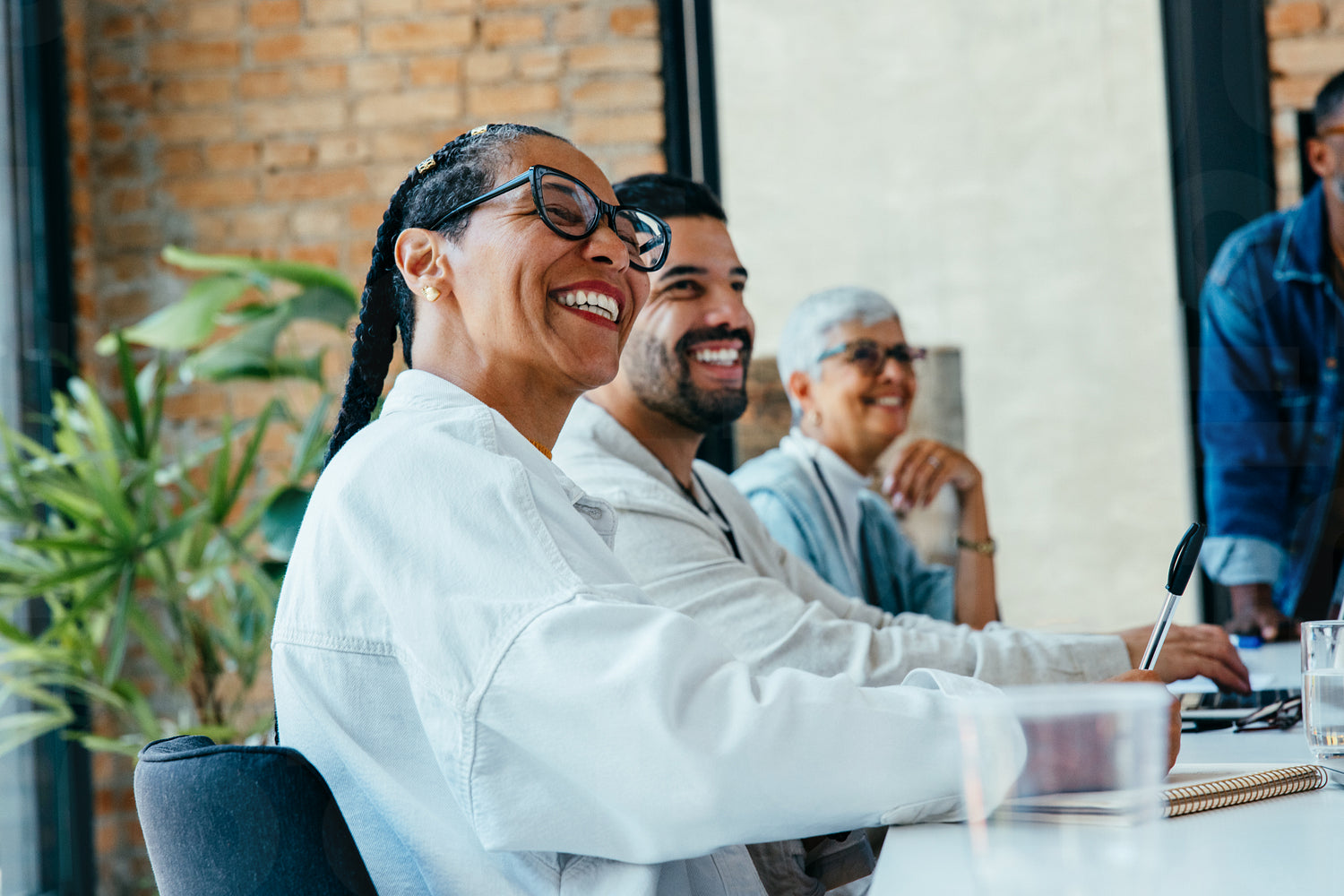 Confident team members collaborating during a meeting, showcasing positive teamwork and engagement in a bright and airy office environment