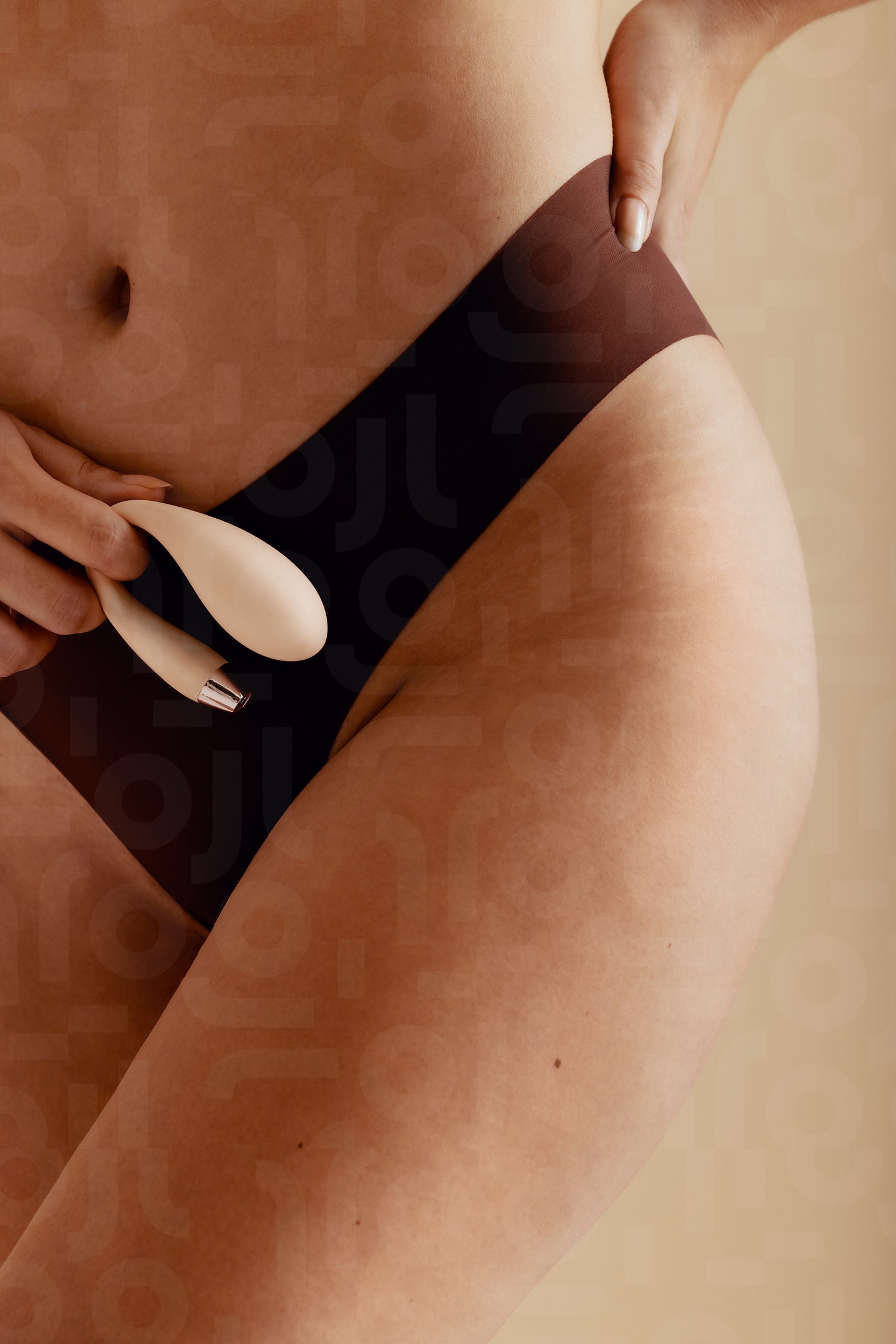 Confident woman exploring her sexual desire with a wearable vibrator in a studio setting