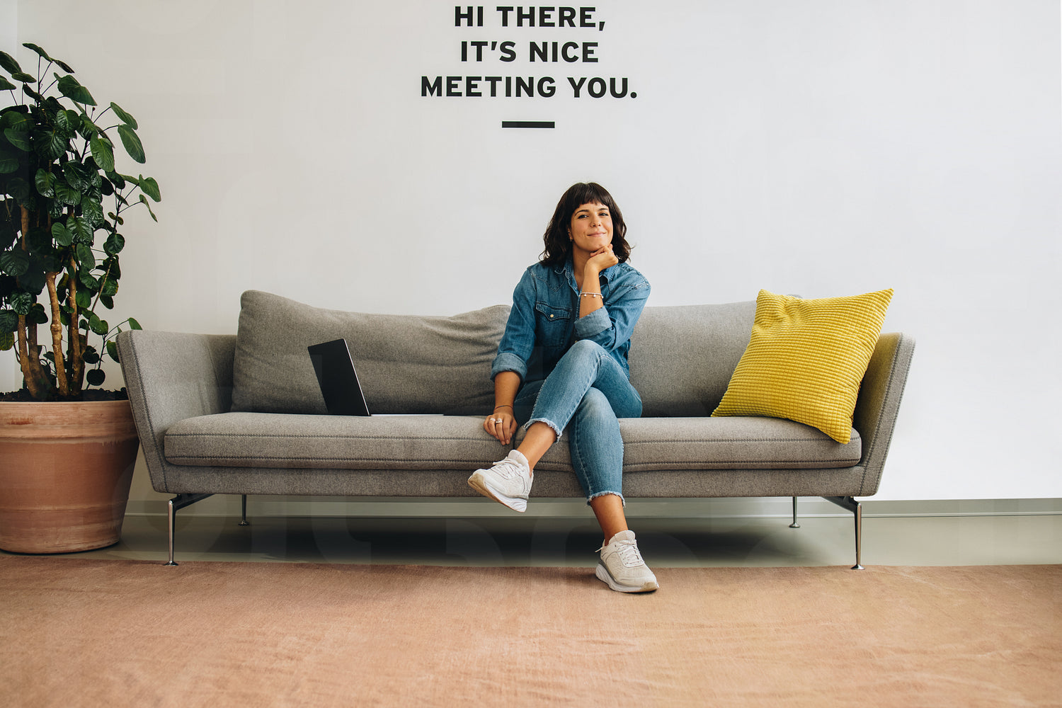 Woman with hand on chin waiting at lobby. Female sitting at lobby on sofa and looking at camera.