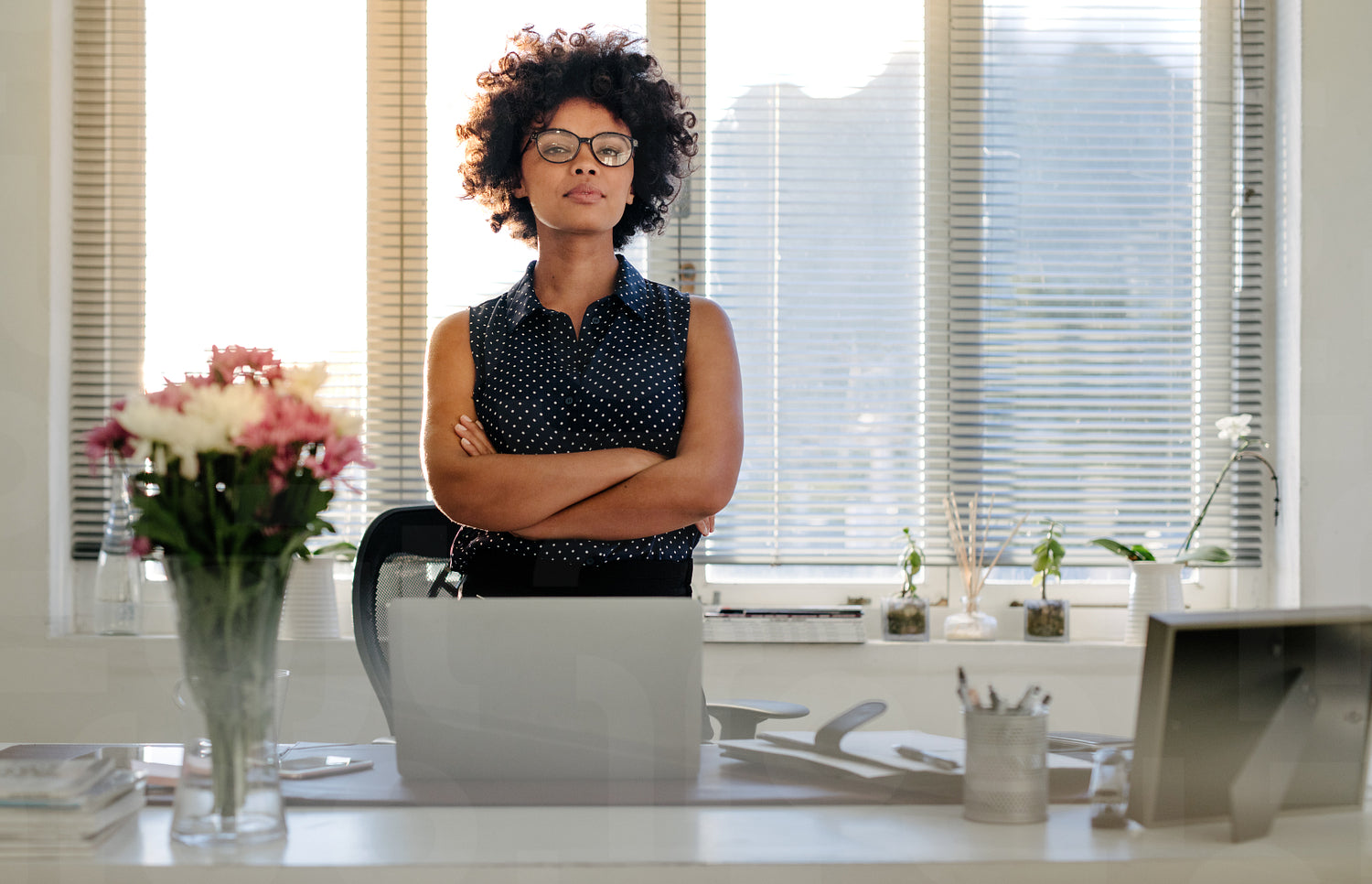 Portrait of confident young businesswoman standing at her desk with arms crossed and looking at camera. African woman with curly hair standing at her workplace.