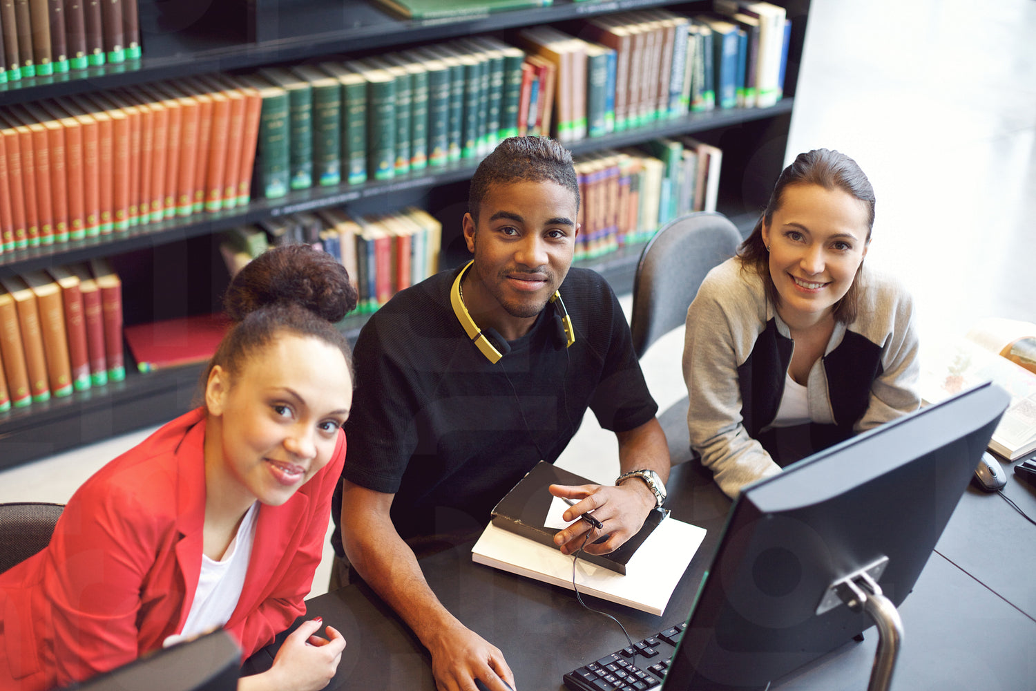 Confident young students at library using computer