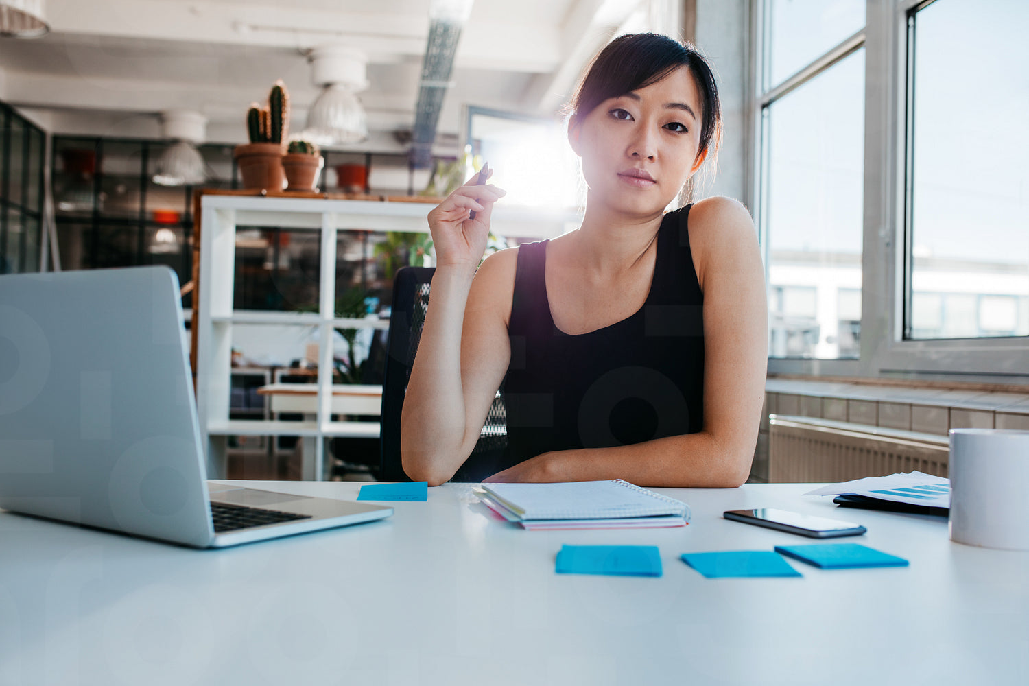 Portrait of confident young woman sitting at her desk with laptop and adhesive notes looking at camera. Asian businesswoman working in modern office.
