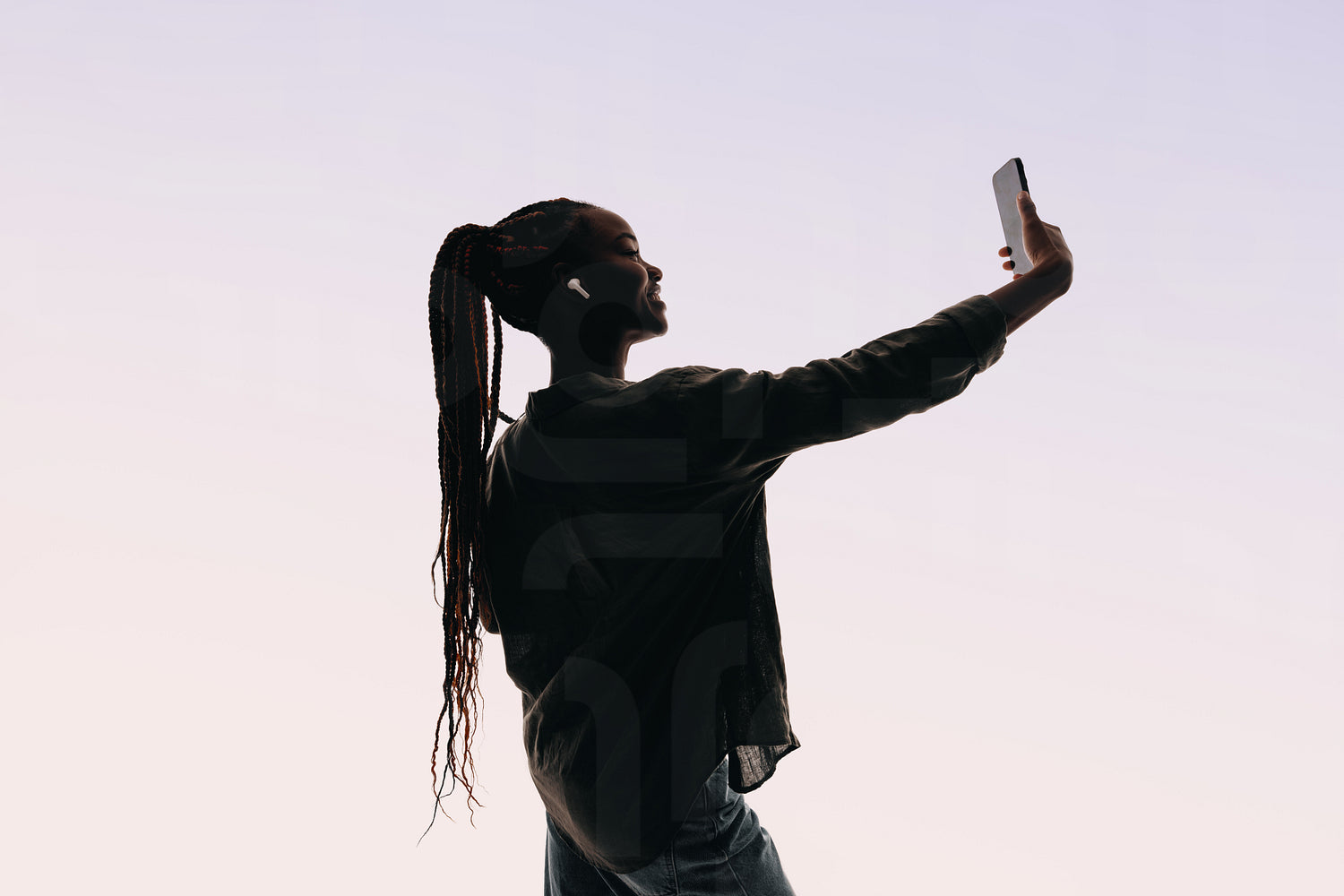 A smiling 20s confident woman uses a mobile app, taking a self-portrait while holding a smartphone and wearing earphones. Her braided hair and expression showcases self-confidence and happiness. The white studio background adds a clean aesthetic. This image portrays a young connected lifestyle.