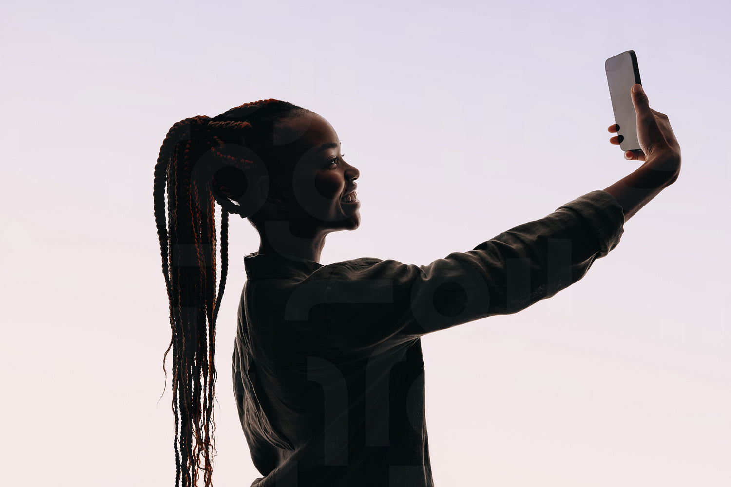 A smiling woman in her 20s stands in a studio for a self-portrait. She holds a cellphone and takes a selfie, highlighting her self-confidence and lifestyle in the generation Z. The white background emphasizes her happiness and joyful expression. Perfect for social media or projects targeting young women.