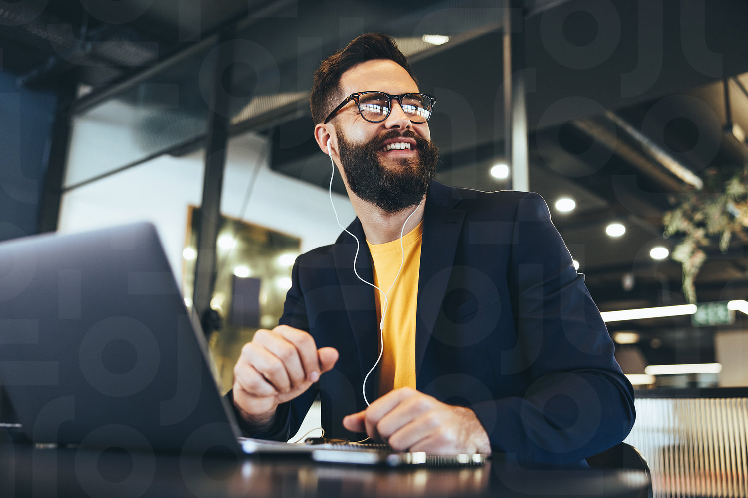 Contemplative businessman smiling and looking away. Happy young entrepreneur listening to music while thinking of new business ideas. Cheerful businessman sitting alone in a modern workspace.
