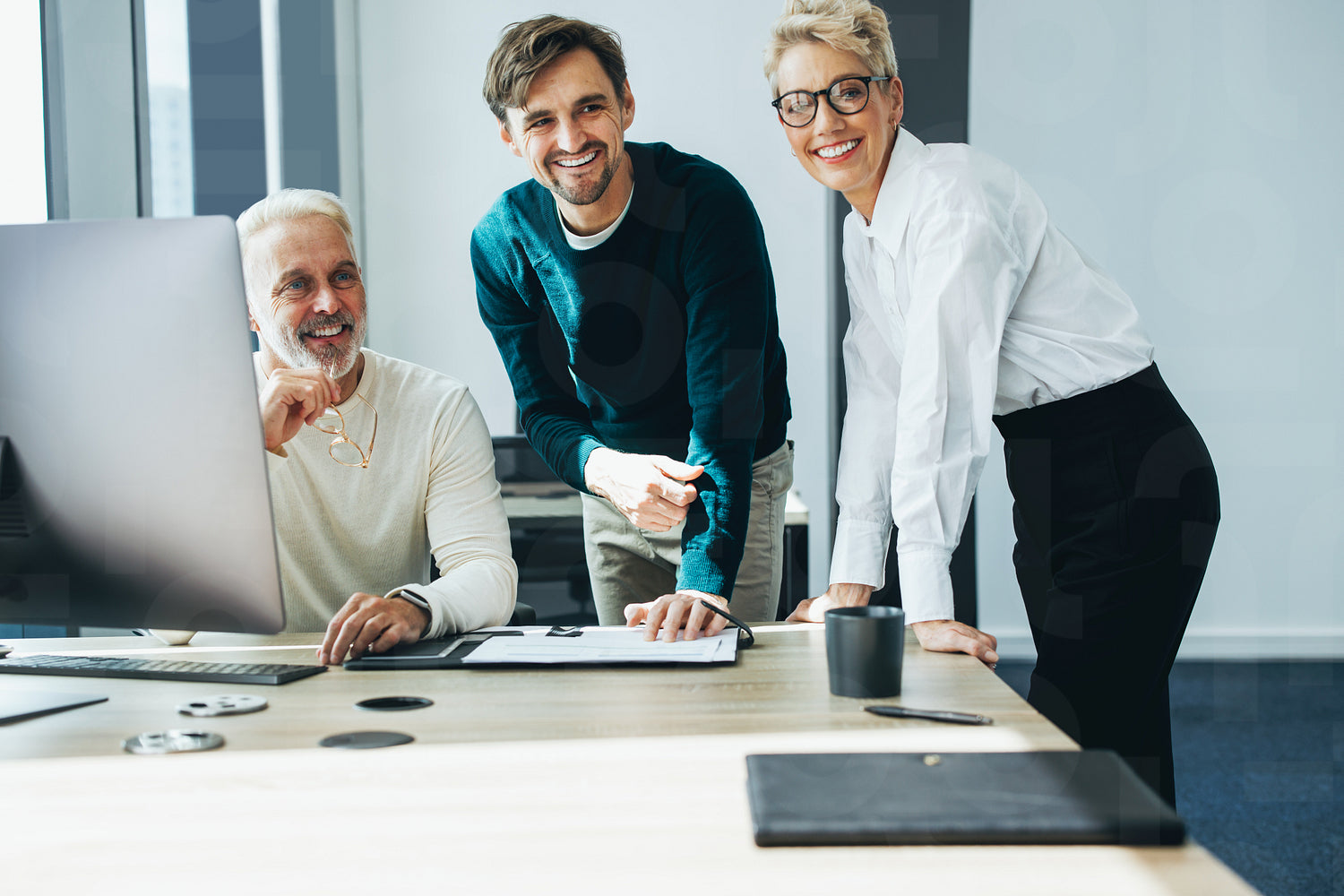 Three corporate coworkers smiling happily as they collaborate and share business ideas for their company. Group of business professionals working around a computer in a modern office.