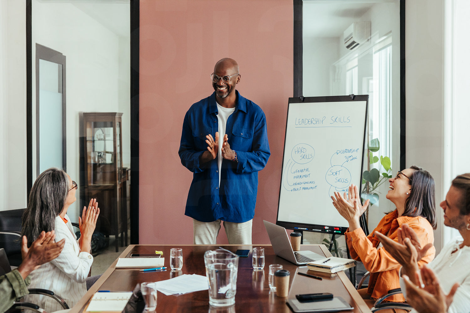 Corporate trainer in a modern office leading a business training workshop. Relaxed and casual atmosphere with team members applauding.