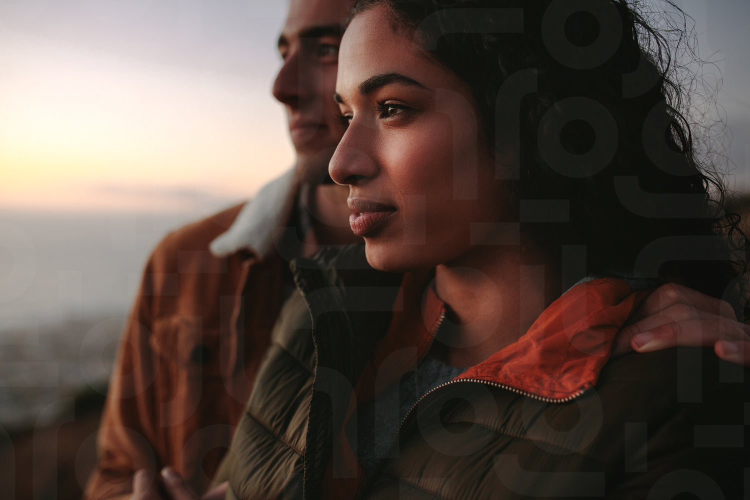 Close up of african woman with her boyfriend standing by looking at view from mountain. Female in winter jacket looking at view with man standing by.