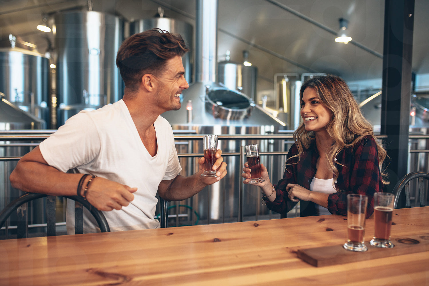 Couple at brewery toasting beers. Young man and woman tasting different varieties of craft beers.