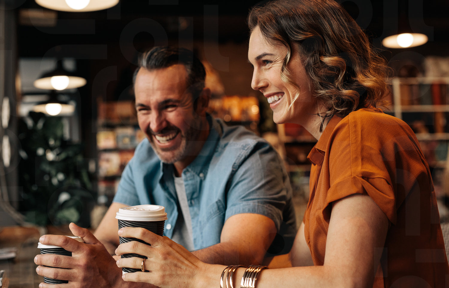 Cheerful couple sitting at cafe having a coffee. Man and woman sitting at restaurant table smiling while having coffee.