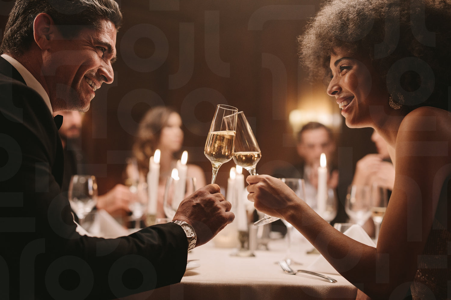 Couple at gala dinner night toasting champagne. Friends at party enjoying drinks.
