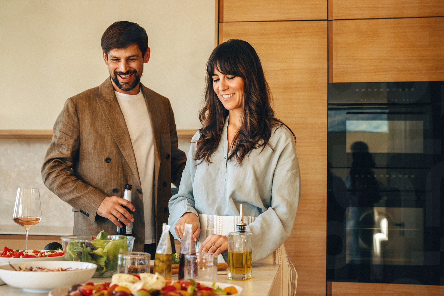 A happy couple is preparing and enjoying a meal together in a stylish kitchen, sharing a moment of bonding, laughter, and appreciation for good food.