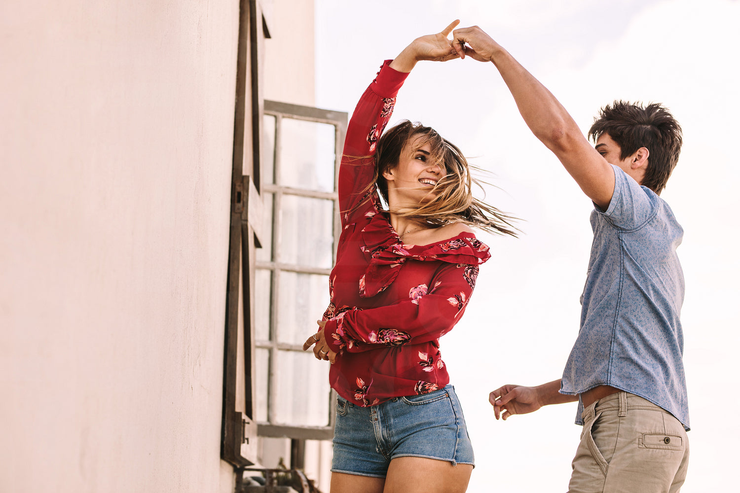 Smiling man and woman dancing. Man turning his girlfriend holding her hand above her head while dancing.