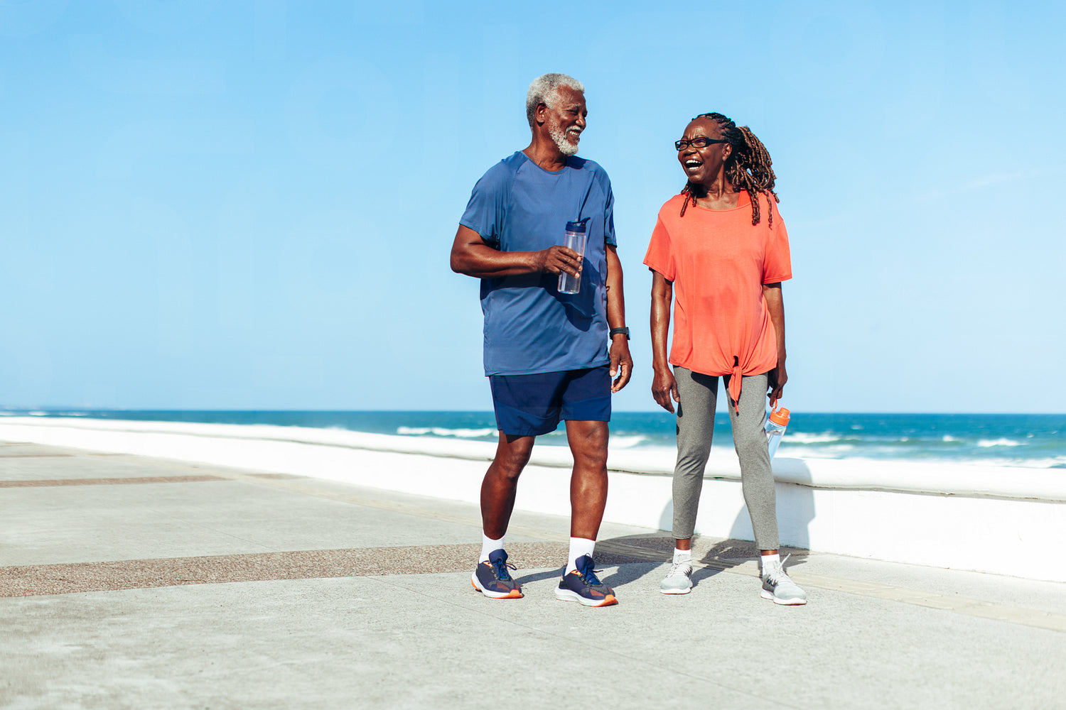 A senior couple joyfully walking together along a sunny beachside promenade, sharing laughter and good times in casual sporty attire.