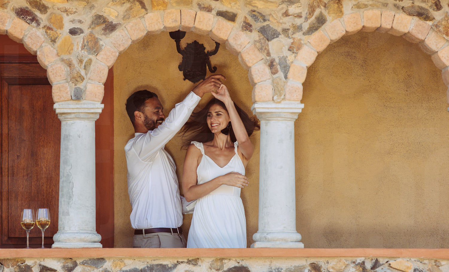 Happy couple on a wine date dancing together. Smiling man and woman dancing in the balcony of an heritage building.