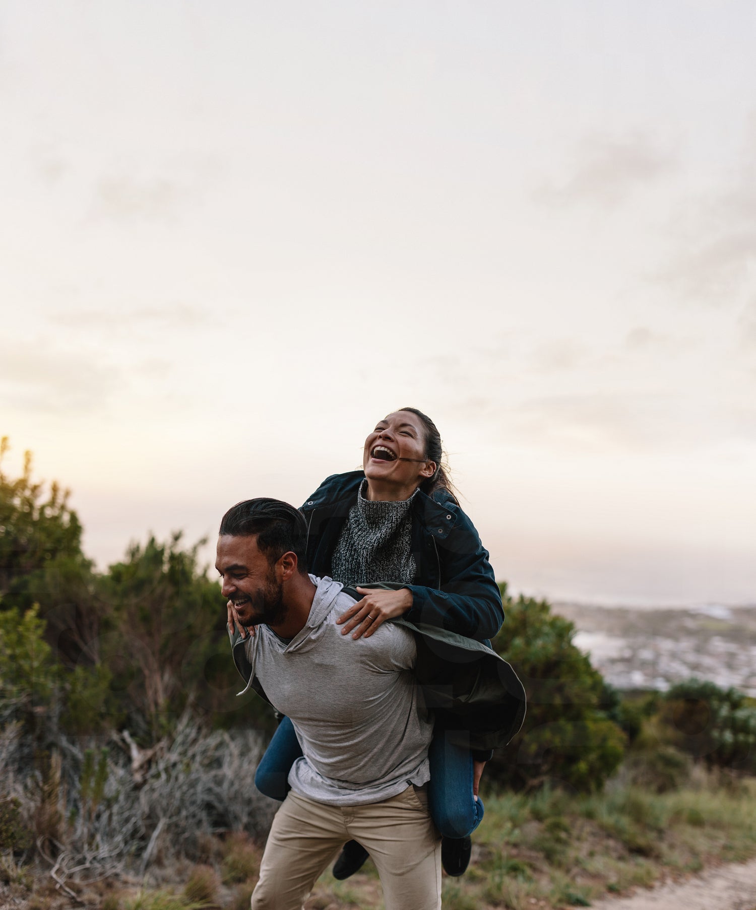 Smiling young man carrying his girlfriend on back. Couple enjoying piggyback ride in countryside.
