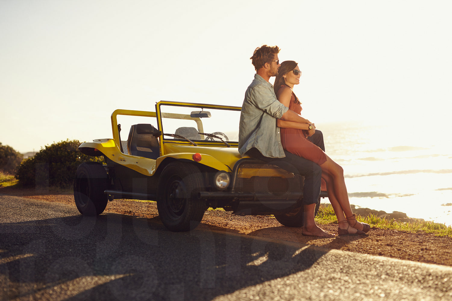 Romantic young couple standing alongside their buggy car while on a roadtrip. Couple enjoying the beach view.
