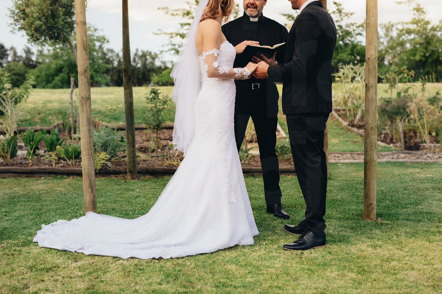 Couple standing before the priest for wedding ceremony outdoors in the park. Bride and groom standing outdoors in the presence of priest during their wedding ceremony.