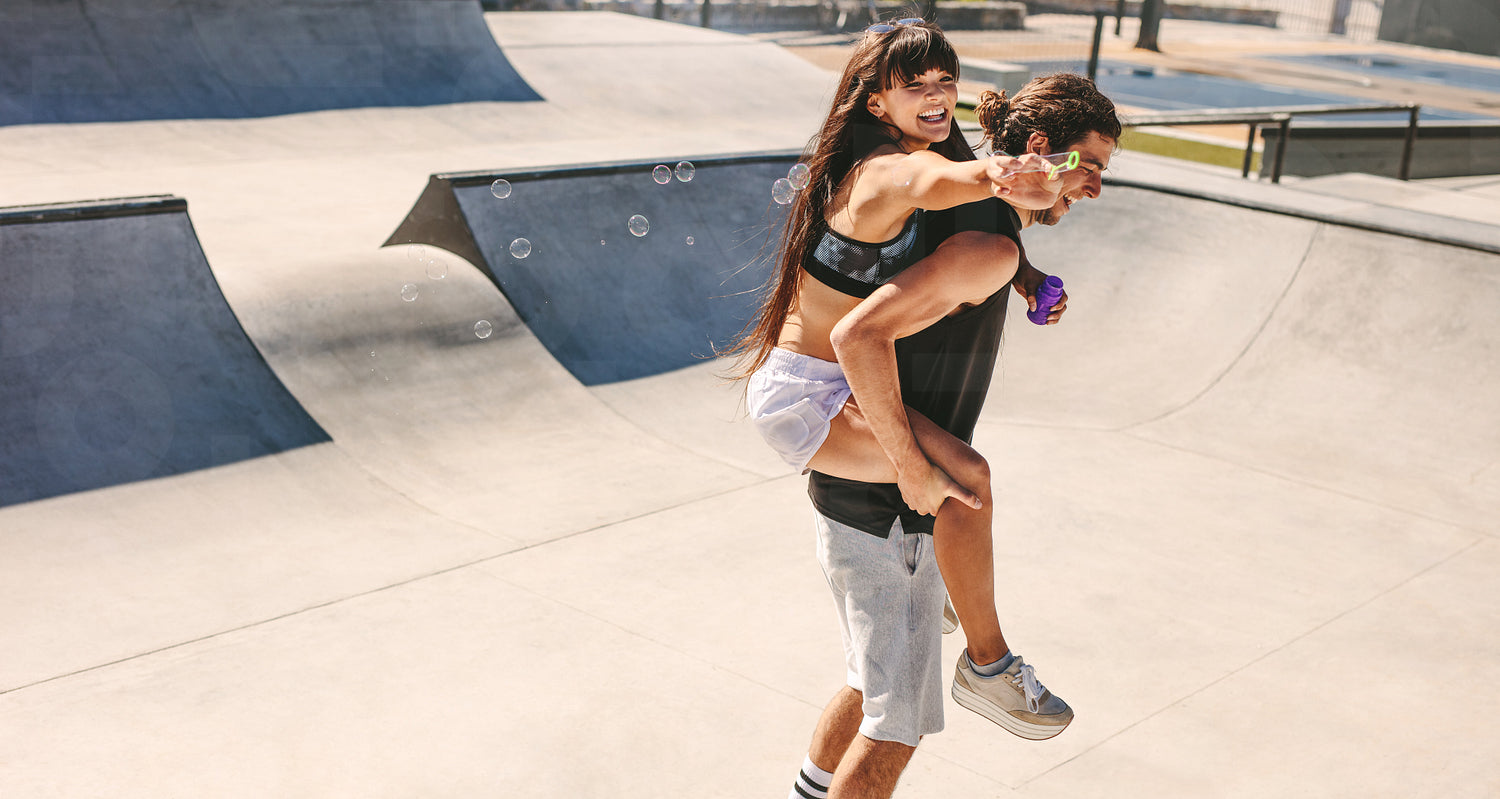 Man giving his boyfriend a piggyback whilst playing with soap bubbles at skate park. Young man and woman having a great time outdoors on a summer day.