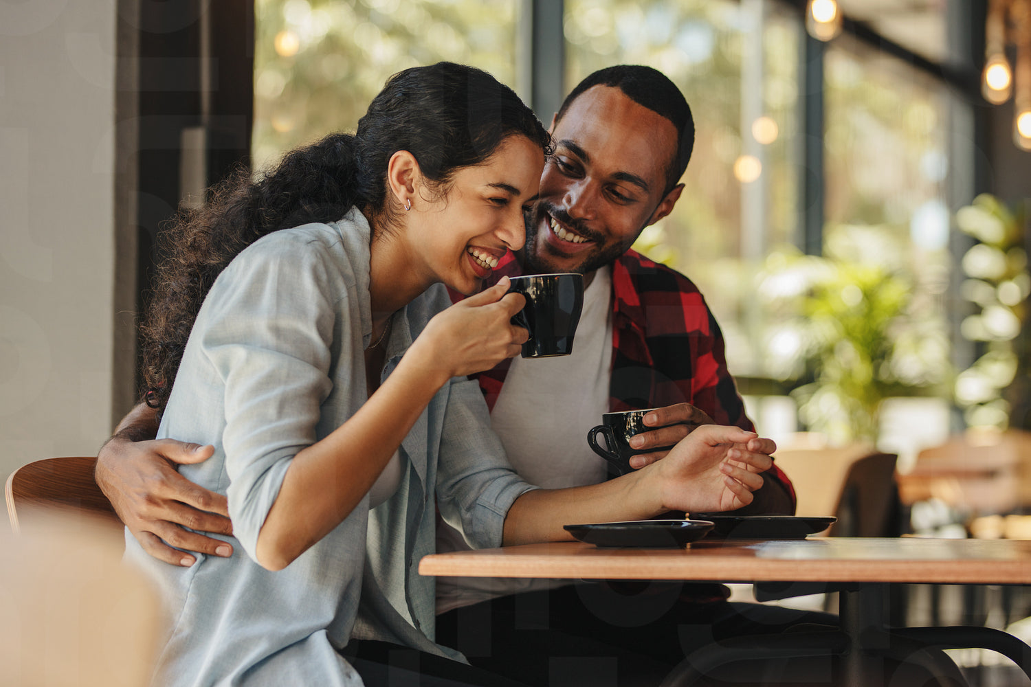 Smiling couple having romantic conversation over a coffee in a cafe. Man and woman having coffee and smiling in a coffee shop.