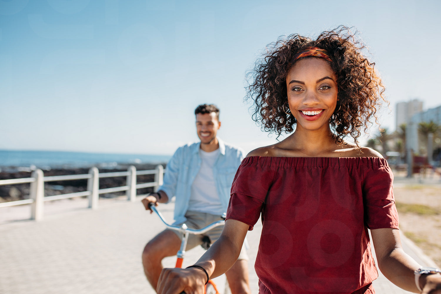 Smiling woman riding a bicycle on the street with her boyfriend following her. Happy couple riding bicycles on a sunny day with sea in the background.