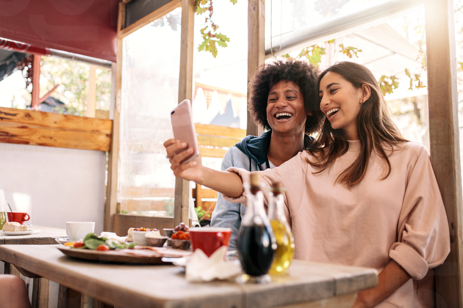 Cheerful woman taking selfie with her friend at cafe. Couple having fun using smartphone at coffee shop