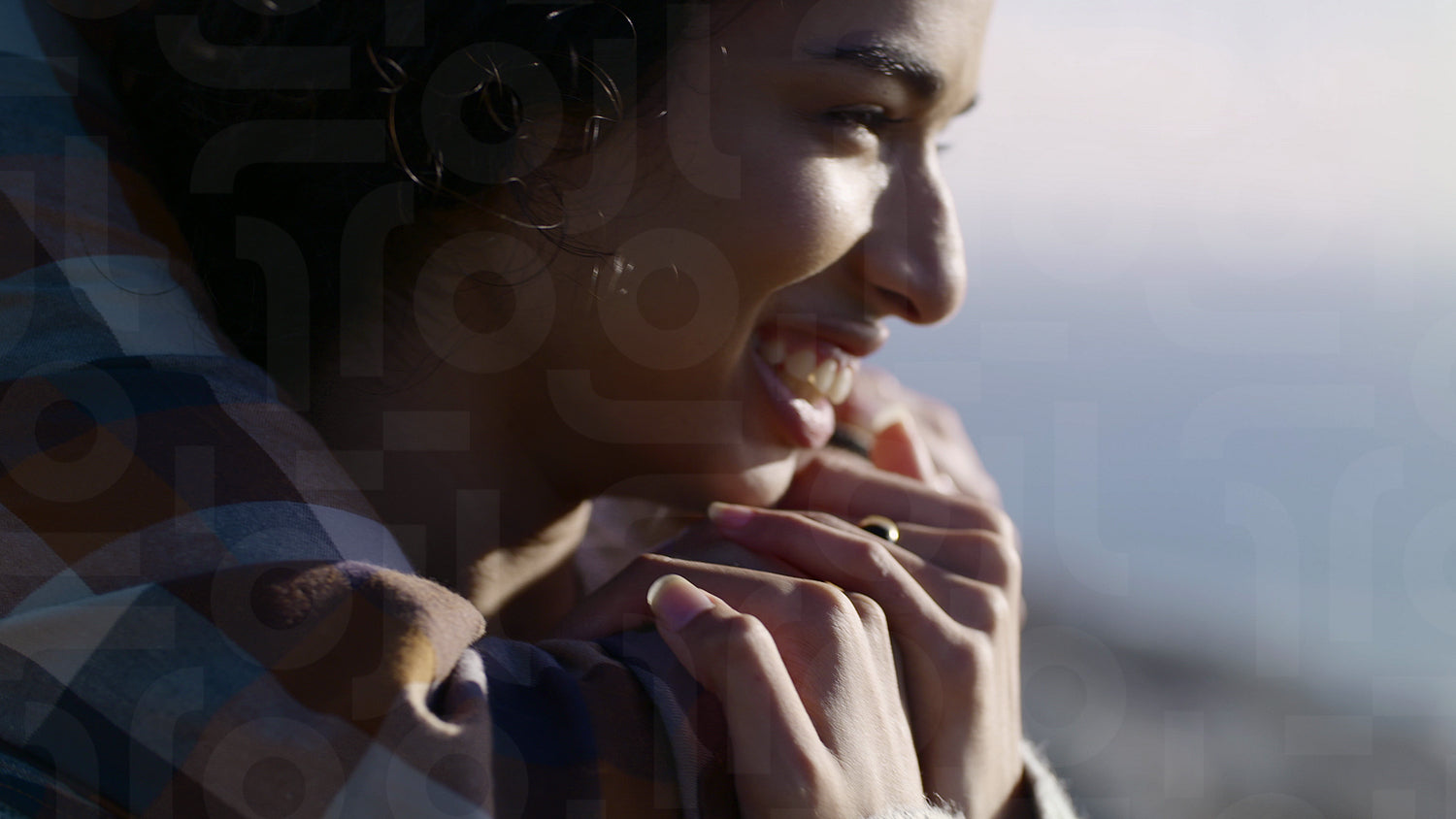 Close up of woman laughing in arms of her boyfriend standing outdoors. Couple having great time together.