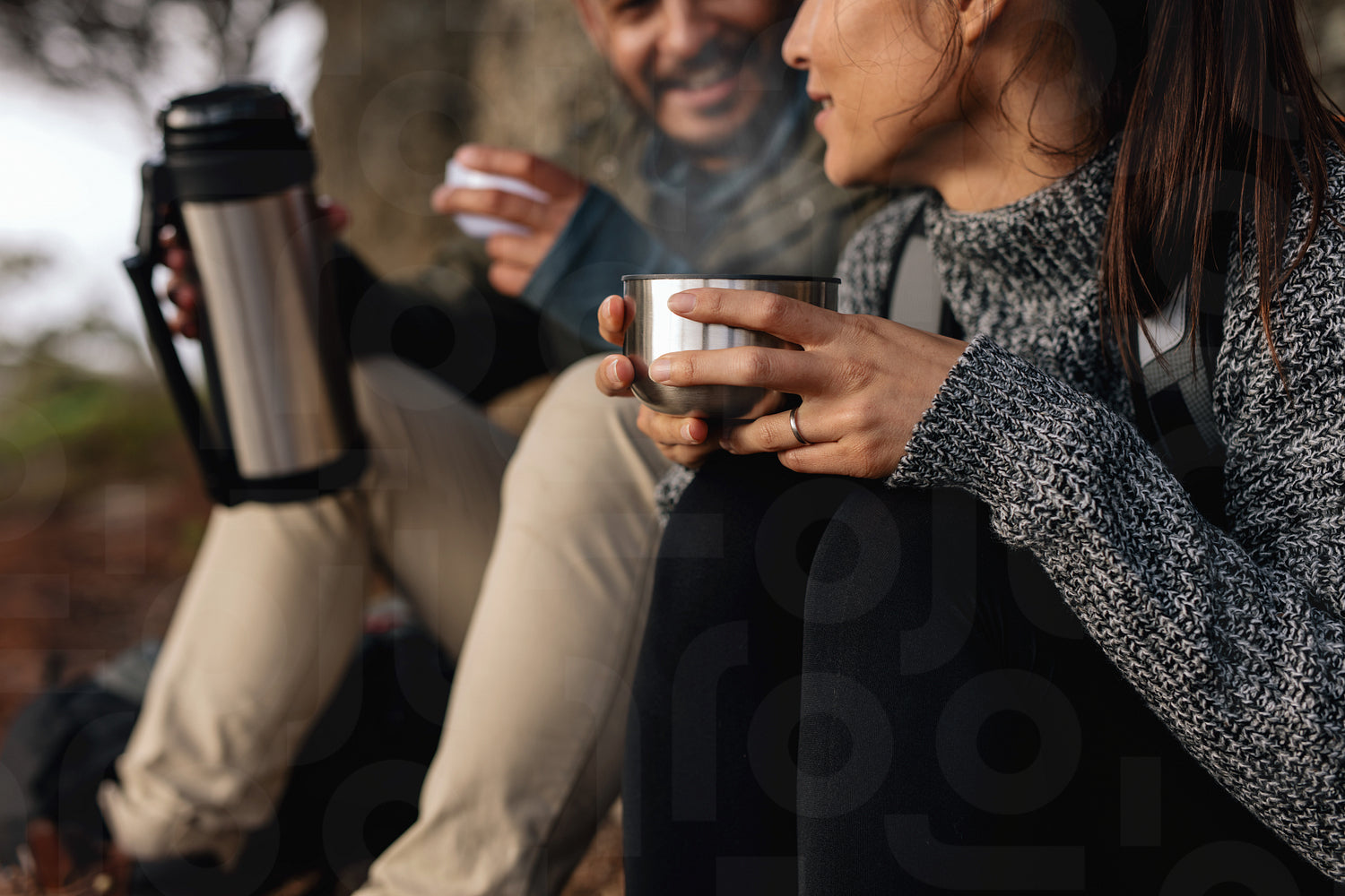 Young woman with her boyfriend taking a break on a hike. Couple hiking talking rest and drinking coffee.