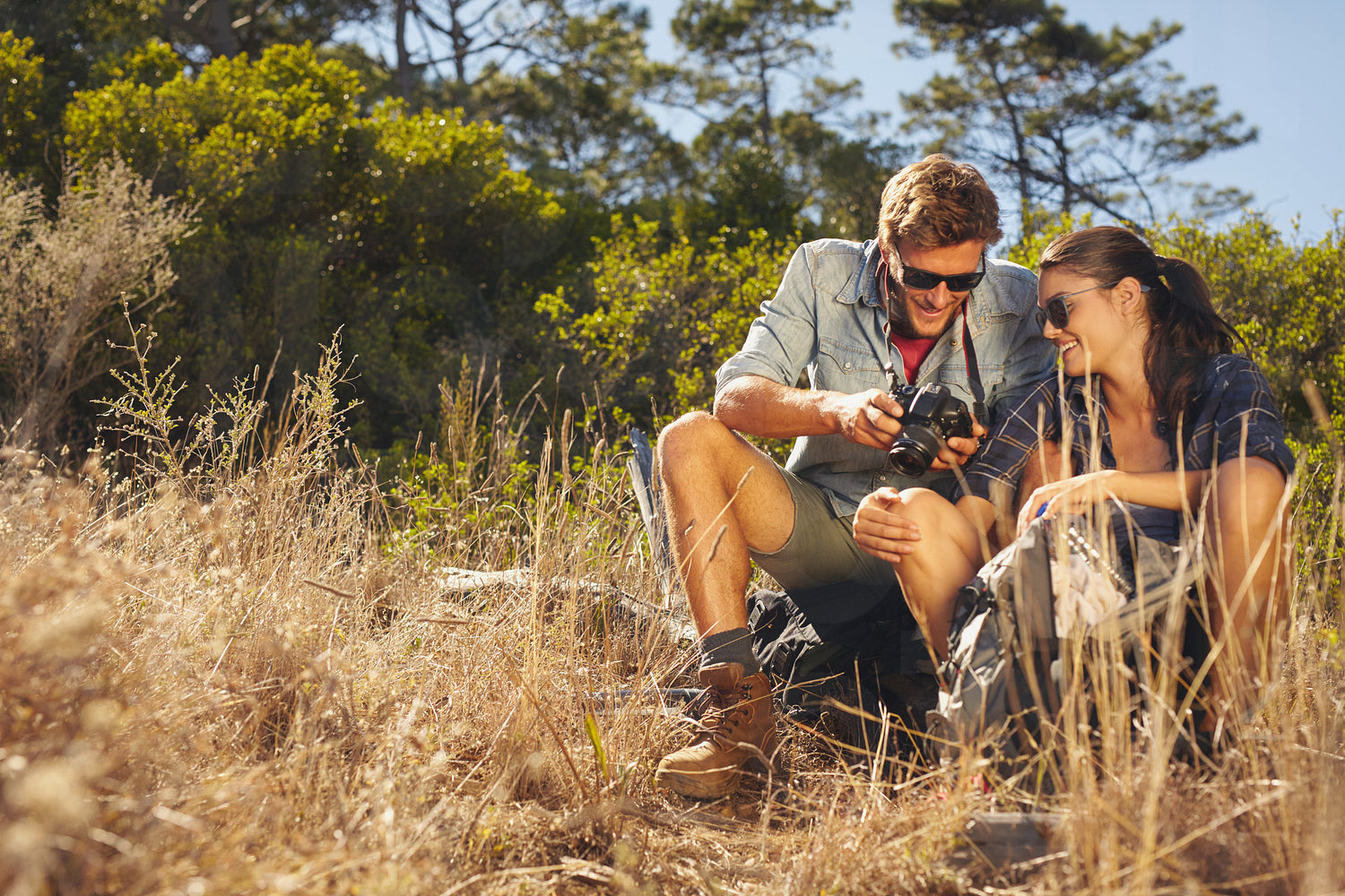 Young couple outdoors looking at photos on camera. Caucasian man and woman on hiking trip taking a break.