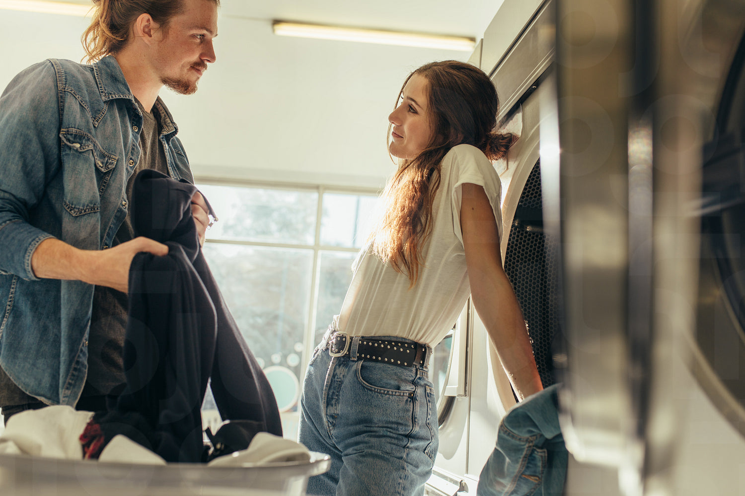 Couple standing in a laundry room looking at each other. Happy couple doing laundry together.