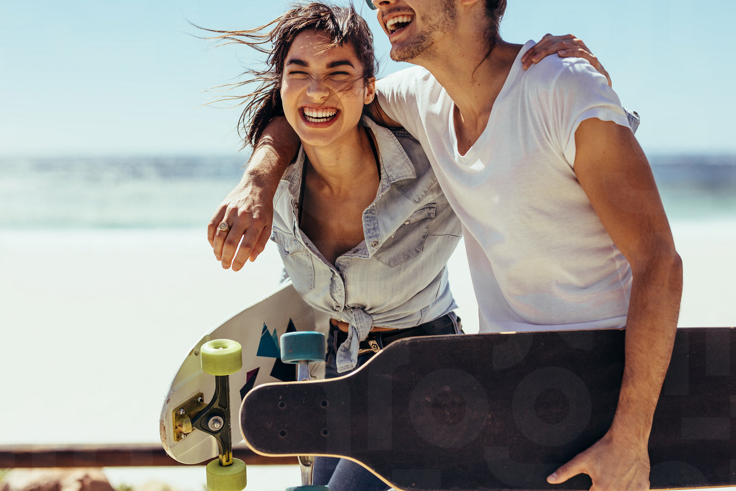 Cheerful woman with her boyfriend walking by the beach. Couple with skateboards having fun at the beach.