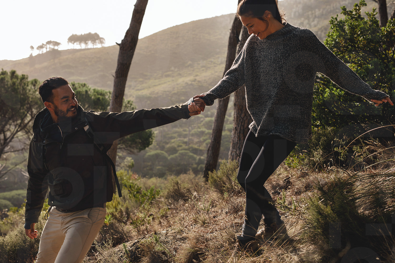 Outdoor shot of young couple enjoying on their hiking trip, walking down the mountain trail. Male hiker helping his girlfriend downhill in the countryside.