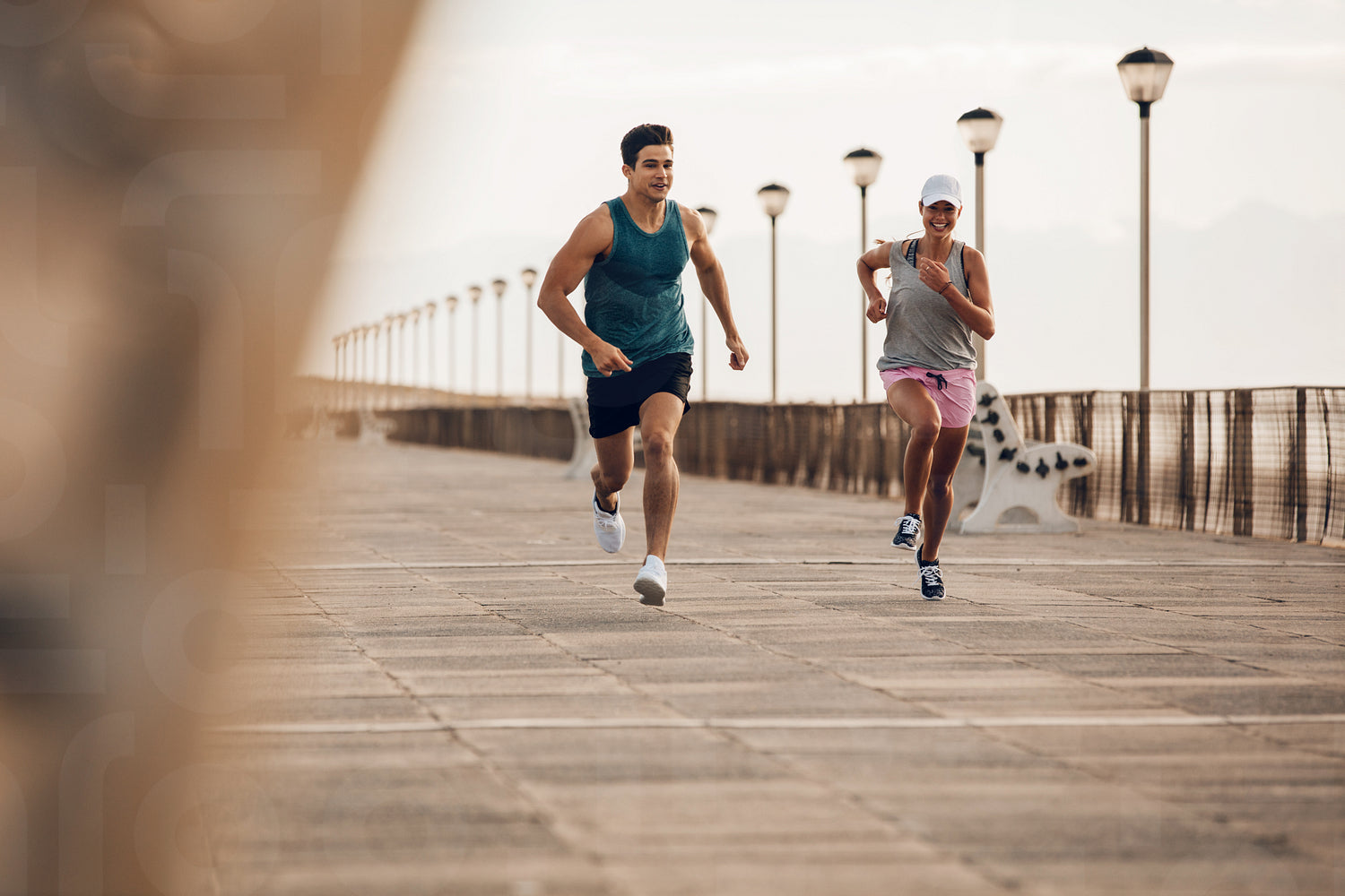 Couple of runners sprinting along the road by the sea. Fitness couple running on the sea side promenade.
